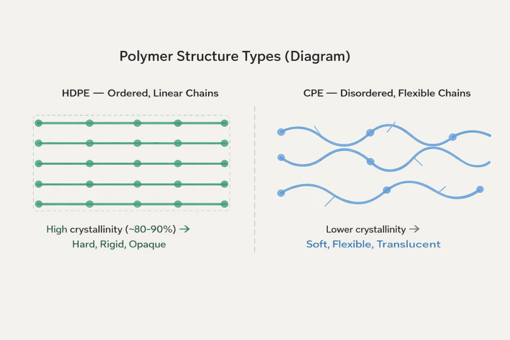 HDPE and the PE used in CPE gloves both belong to the Polyethylene family — long repeating chains of –(CH₂–CH₂)ₙ–. The critical difference is the degree of chain regularity and packing density, which determines whether the material feels stiff and crinkly or soft and stretchy.