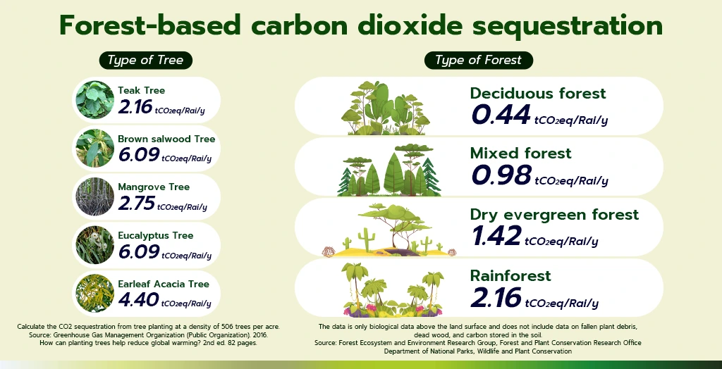 - Newly established forests: 0.44 tCO₂eq/rai/year