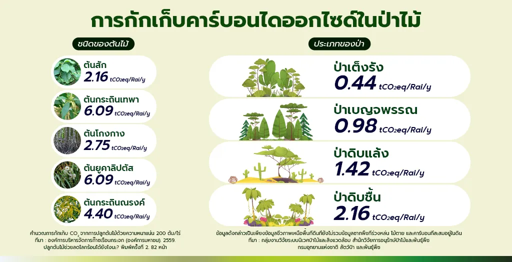 • ยูคาลิปตัสและกระถินเทพา: กักเก็บเฉลี่ย 6.09 tCO₂eq/ไร่/ปี