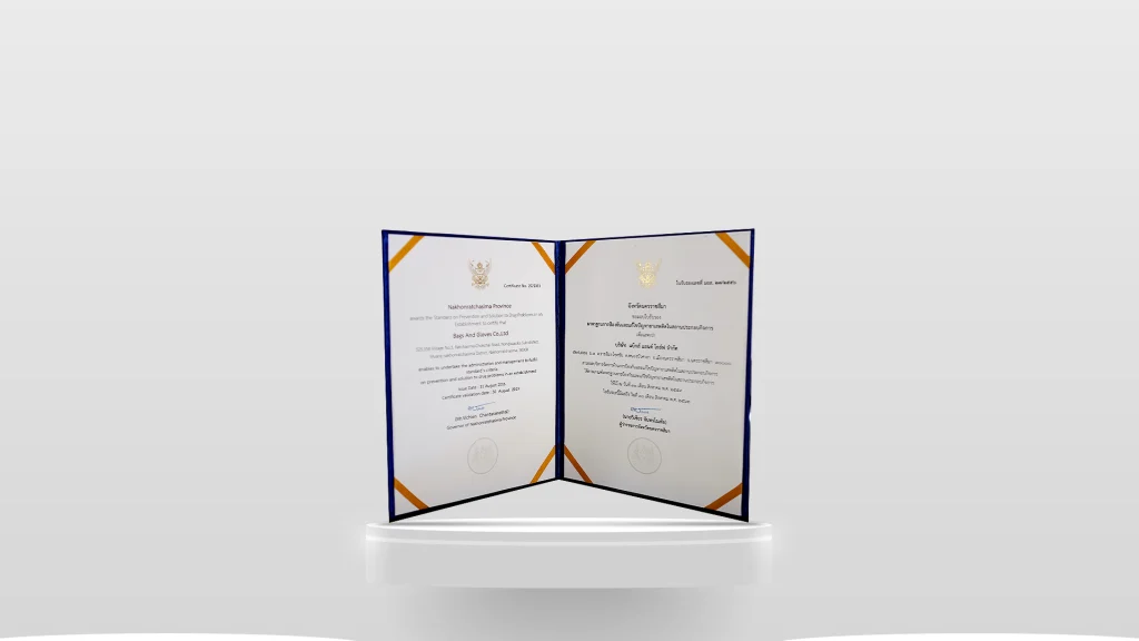 ใบรับรองดังกล่าวมอบให้ ณ วันที่ 31 สิงหาคม 2559 และมีผลถึงวันที่ 30 สิงหาคม 2562 เป็นอีกหนึ่งความภาคภูมิใจที่สะท้อนถึงความมุ่งมั่นของบริษัทในการสร้างสภาพแวดล้อมการทำงานที่ปลอดภัย ปราศจากยาเสพติด และส่งเสริมคุณภาพชีวิตที่ดีให้แก่พนักงานทุกคน