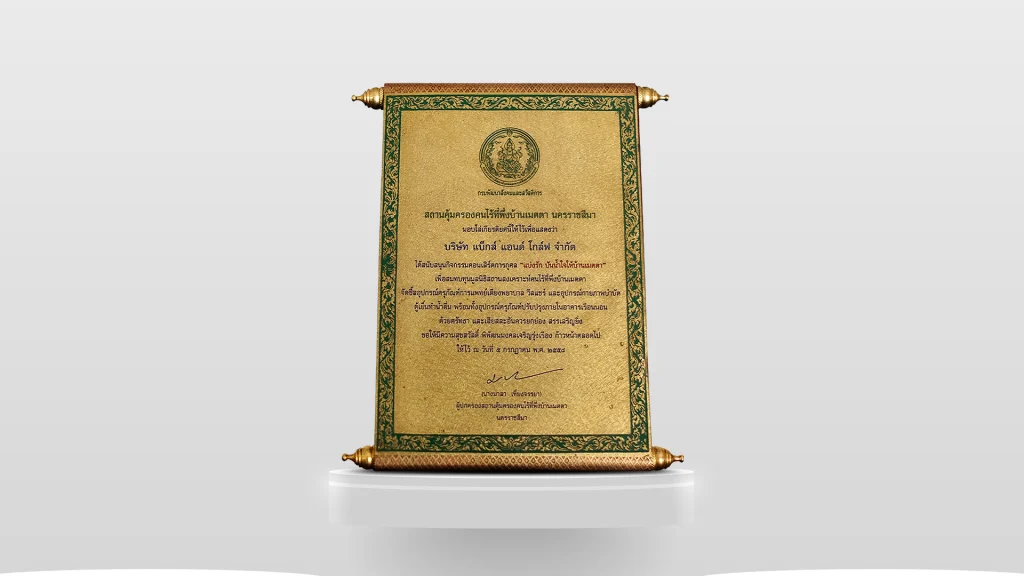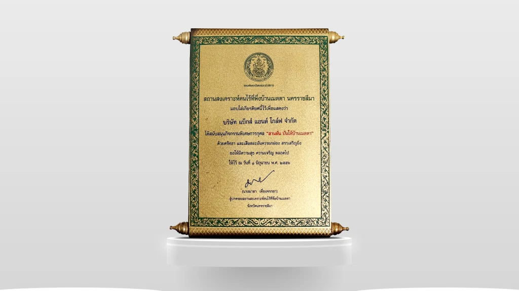 บริษัท แบ็กส์ แอนด์ โกล์ฟ จำกัด (Bags and Gloves Co., Ltd.) ได้รับมอบ โล่เกียรติยศจากกรมพัฒนาสังคมและสวัสดิการ สถานสงเคราะห์คนไร้ที่พึ่งบ้านเมตตา จังหวัดนครราชสีมา เพื่อแสดงถึงการให้การสนับสนุนกิจกรรมพิเศษการกุศล “สานฝัน ปันให้บ้านเมตตา” ด้วยความศรัทธาและความเสียสละอันควรแก่การยกย่อง
