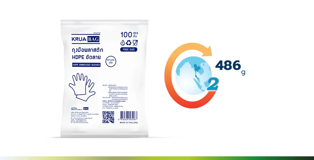 บริษัทฯ ได้จัดทำ CFP ถุงมือพลาสติก HDPE สีใส (HDPE Natual Embossed Glove), ไซส์ L, ความหนา 10 micron, ขนาดบรรจุ 100 ชิ้น/ถุง, brand : KRUA-BAG (house brand ของบริษัทฯ) ขึ้นทะเบียนกับองค์การบริหารก๊าซเรือนกระจก (อบก.) โดยได้ค่า CFP เท่ากับ 486 gCO2e (กรัมคาร์บอนไดออกไซด์เทียบเท่า)